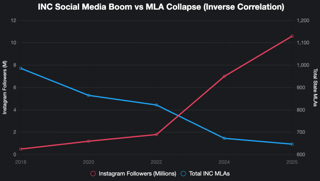 The chart looks even worse when we map the data with INC’s performance on Instagram. As INC’s follower count on Instagram went up, the number of its MLAs in State Assemblies across the country went down.