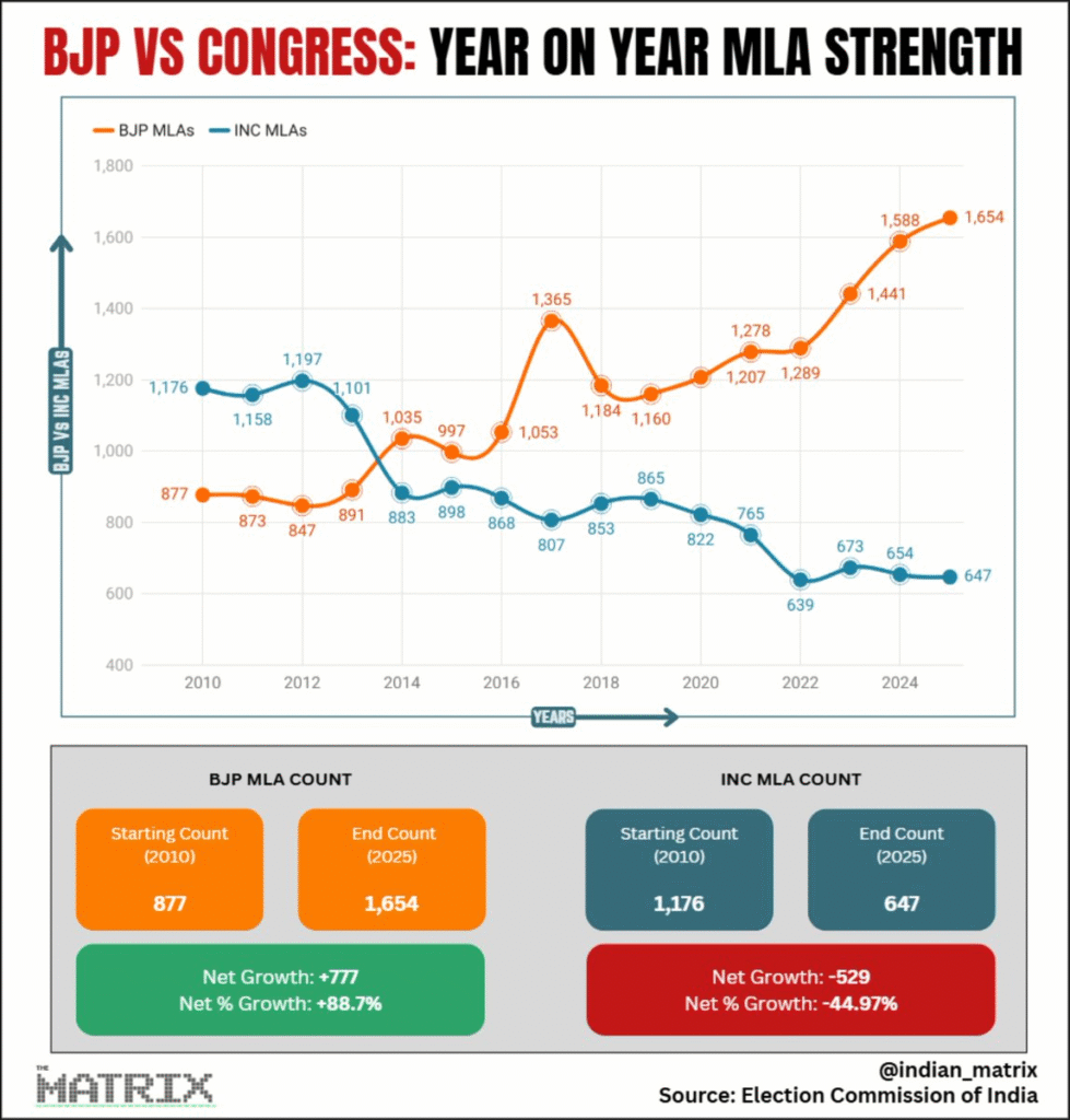 The Matrix, an account on X, shared a chart of year-on-year MLA strength of the BJP and Congress since 2010. I don’t have to say anything. The chart makes my point very clear.