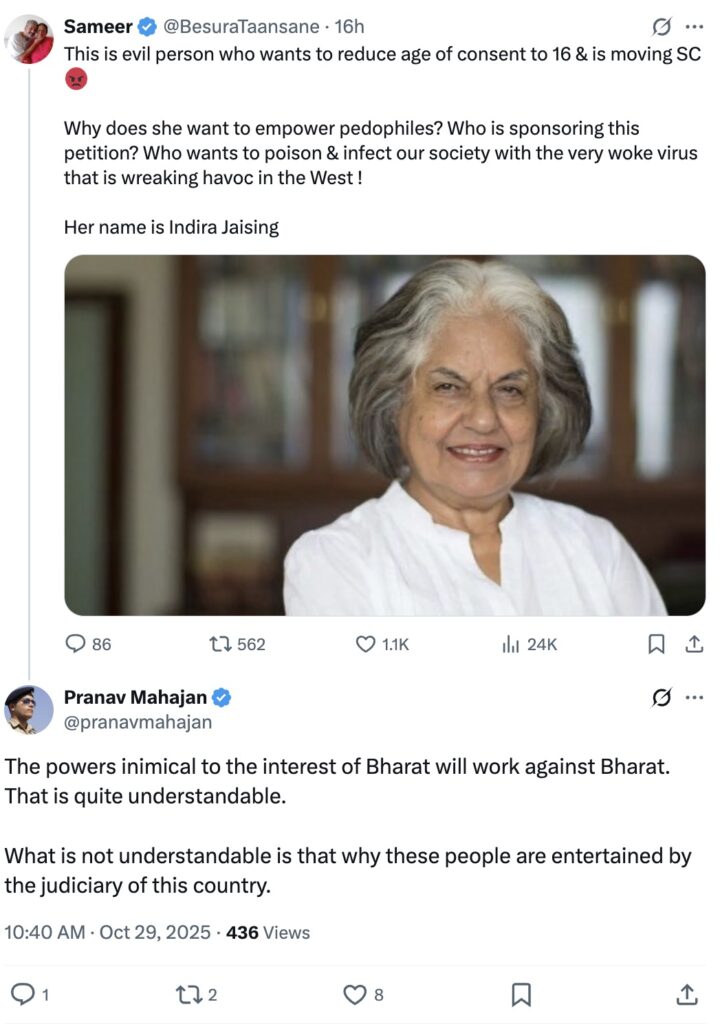 One user accused advocate Indira Jaising of wanting to empower pedophiles. Policeman Pranav Mahajan further added that it is incomprehensible why the Judiciary entertains such individuals.