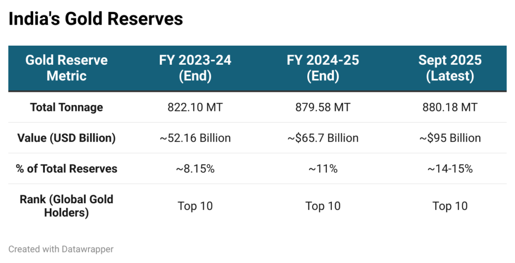 India’s gold reserves have steadily expanded from 822.10 metric tonnes in FY24 to 879.58 MT in FY25, reaching 880.18 MT by September 2025. Gold now accounts for 14-15% of total reserves, up from 8.15% just two years earlier.