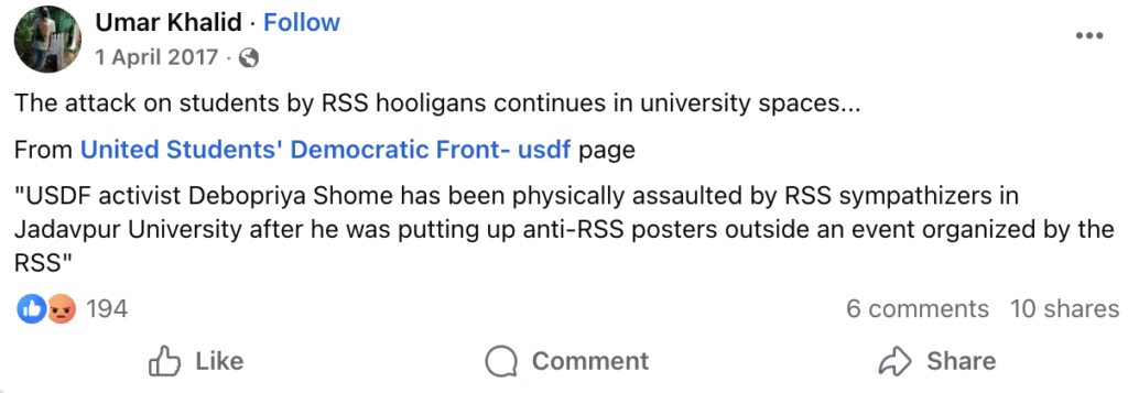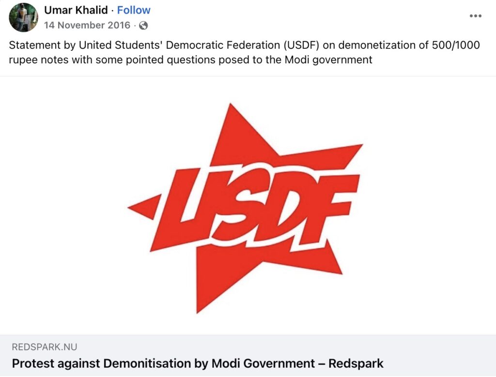 It is hard to say how deep these ties were. But the ties cannot be denied. The organisation at the root of this is called the United Students Democratic Front (USDF). Umar Khalid in 2016-17 often promoted them on social media. He even quoted their posts verbatim.