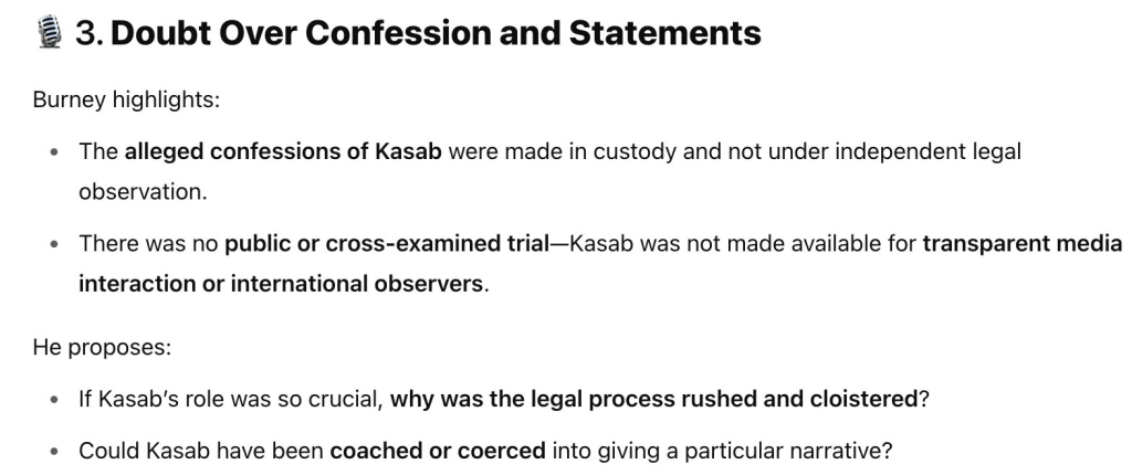Aziz Burney questioned even the legal proceedings and Kasab’s confessions. He makes a huge deal out of the fact that the confessions were made in legal custody and not under independent legal observation. He also attempts to create an aura of suspicion around the fact that international media and observers were not provided access to Kasab.